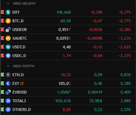 Tuttavia, se dovesse verificarsi una discesa, è probabile che si tratti di una correzione flash, un’ultima spinta ribassista per raccogliere più liquidità prima di un rimbalzo. Nonostante queste incertezze, mantengo una visione rialzista: negli ultimi giorni ho osservato segnali di un possibile cambiamento di trend negli indici principali, che considero “I quattro pilastri fondamentali della crescita crypto”. Mentre “le quattro ombre nere del mercato crypto“, che puoi vedere in dettaglio, mostrano segni di debolezza e potrebbero invertire il trend al ribasso, come si vede chiaramente. Poi certo, bisognerà valutare la durata di questo movimento, ma un po’ di ottimismo ci vuole.